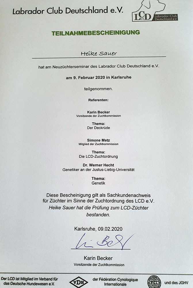 Somit stand der Zuchtzulassung zum Deckrüden des LCD nicht mehr im Weg und Sam wurde heute als Deckrüde beim LCD zugelassen.